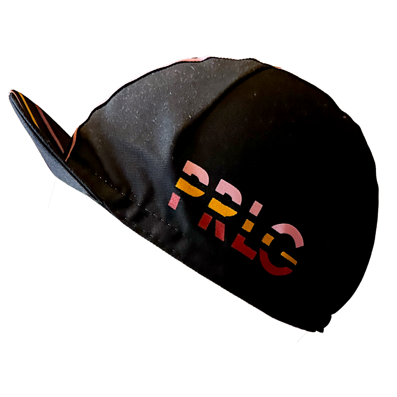Nostalgisch en functioneel; de koerspet. Met een zwarte basiskleur is deze koerspet voorzien van de kenmerkende driekleur van De Proloog. Met een roze, gele en rode streep over de gehele lengte kleurt de pet mooi op. De ene zijkant is voorzien van het vaker terugkerende rondje en de andere van het PRLG beeldmerk. Het PRLG beeldmerk is hierbij ook in stijl van gebruikte strepen.
